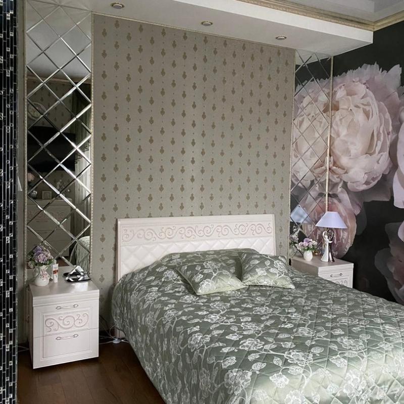 Симметричные панно по обеим сторонам от изголовья кровати выполнены из квадратной зеркальной плитки с фацетными гранями. Обрамление цветным молдингом позволяет легко вписать их в стилистику интерьера.
